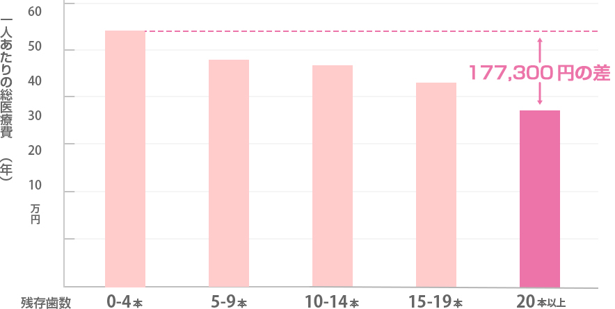 残存歯数が0~4本の人は、残存歯数が20本以上の人と比較すると、医療費が1.5倍、糖尿病医療費が1.3倍、虚血性心疾患医療費が3.4倍となっています。残っている歯が少ないほど病になるリスクが高く、年間にかかる医療費も大きくなっていることがわかります。
